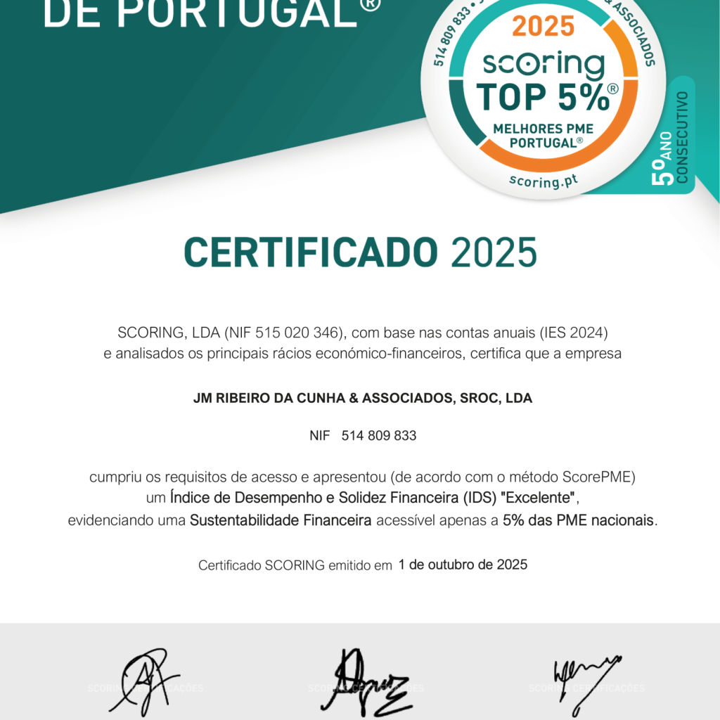 The 2025 edition of the TOP 5% Best SMEs in Portugal once again includes JM Ribeiro da Cunha & Associados among the companies distinguished by Scoring. The recognition is awarded to the firm for the fifth consecutive year and, according to the certifying body, is attainable by only 5% of the companies.