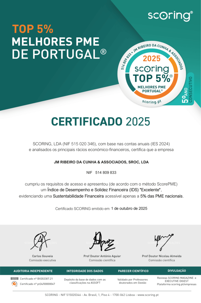 A edição 2025 do TOP 5% Melhores PME de Portugal volta a incluir a JM Ribeiro da Cunha & Associados entre as empresas distinguidas pela Scoring, o que sucede pelo 5º ano consecutivo e, segundo a entidade certificadora, está ao alcance de apenas 5% das empresas.